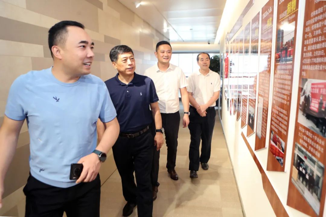 河南中医药大学校长许二平(左2),河南中医药仲景研究院院长徐立然(右1)在顾问王新瑞和新中盟集团董事长王帅的陪同下参观党建、九三学社、华夏德门慈善基金会文化展厅